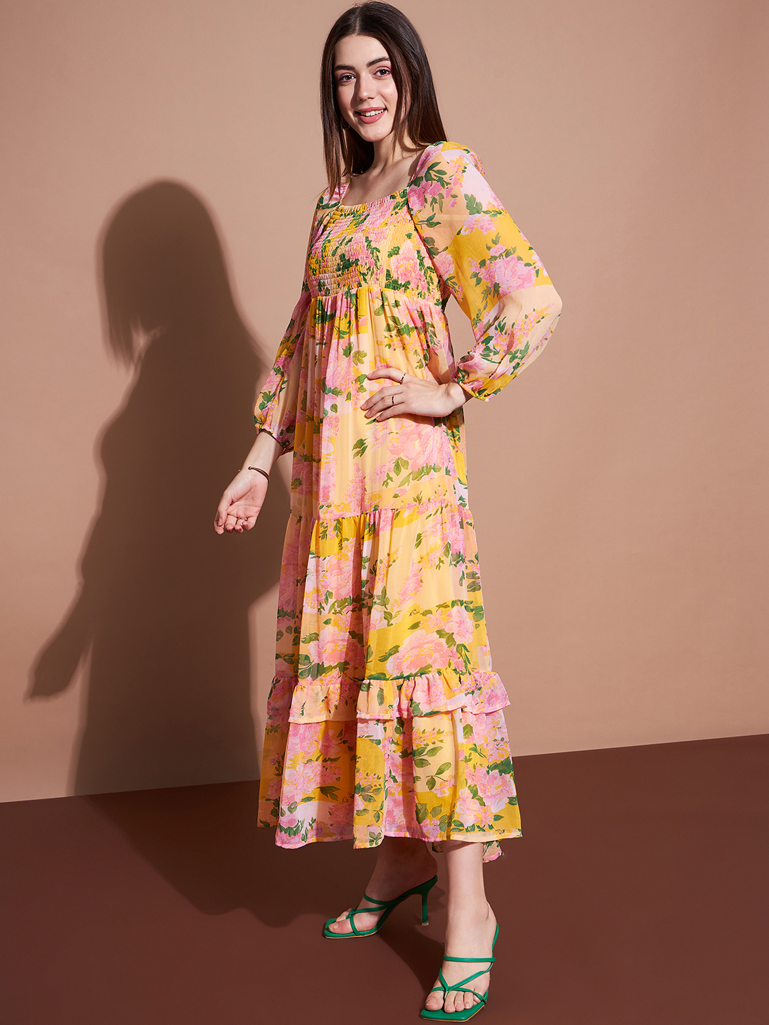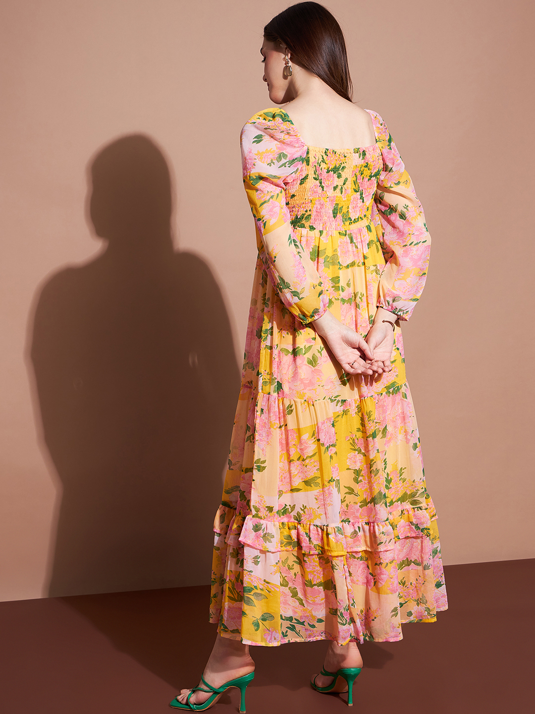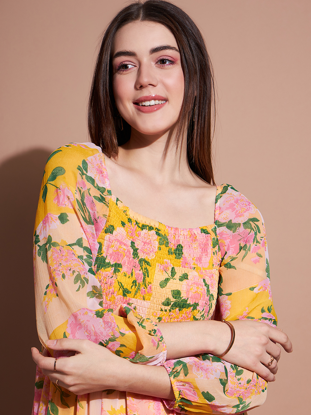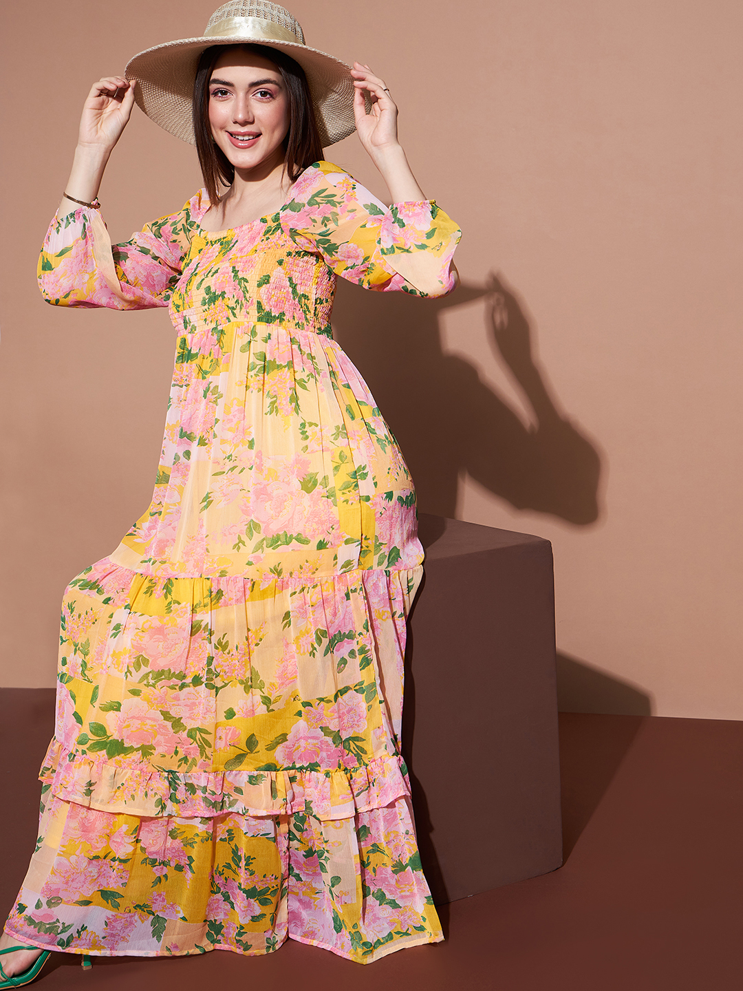 Exude sophistication and charm with this Elegant Floral Maxi Dress, designed with a stunning blend of soft pink and muted floral tones on a neutral backdrop. Featuring a high neckline with delicate pleats, short puff sleeves, and a flowy A-line silhouette, this dress brings effortless grace to any occasion. The cinched waist enhances the figure, while the ruffled hemline provides soft movement, making this dress a perfect choice for both casual outings and special events.