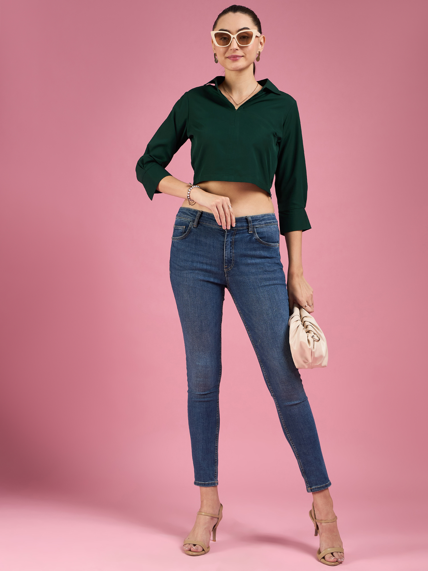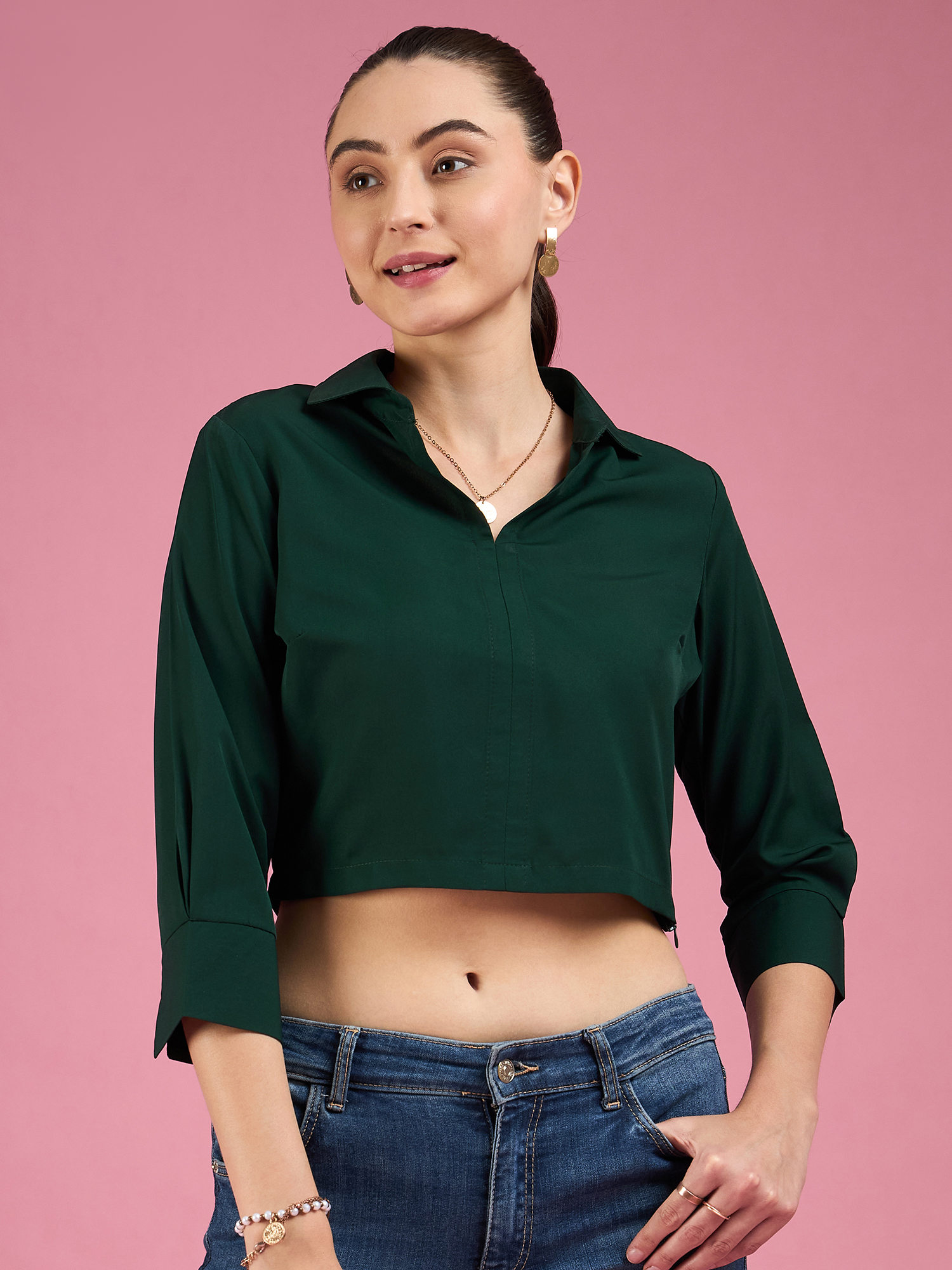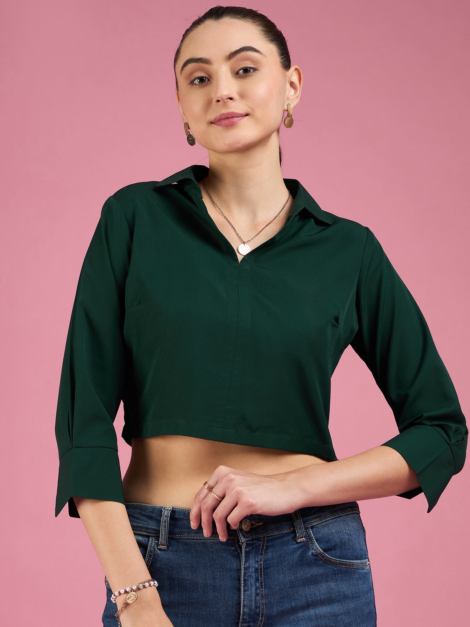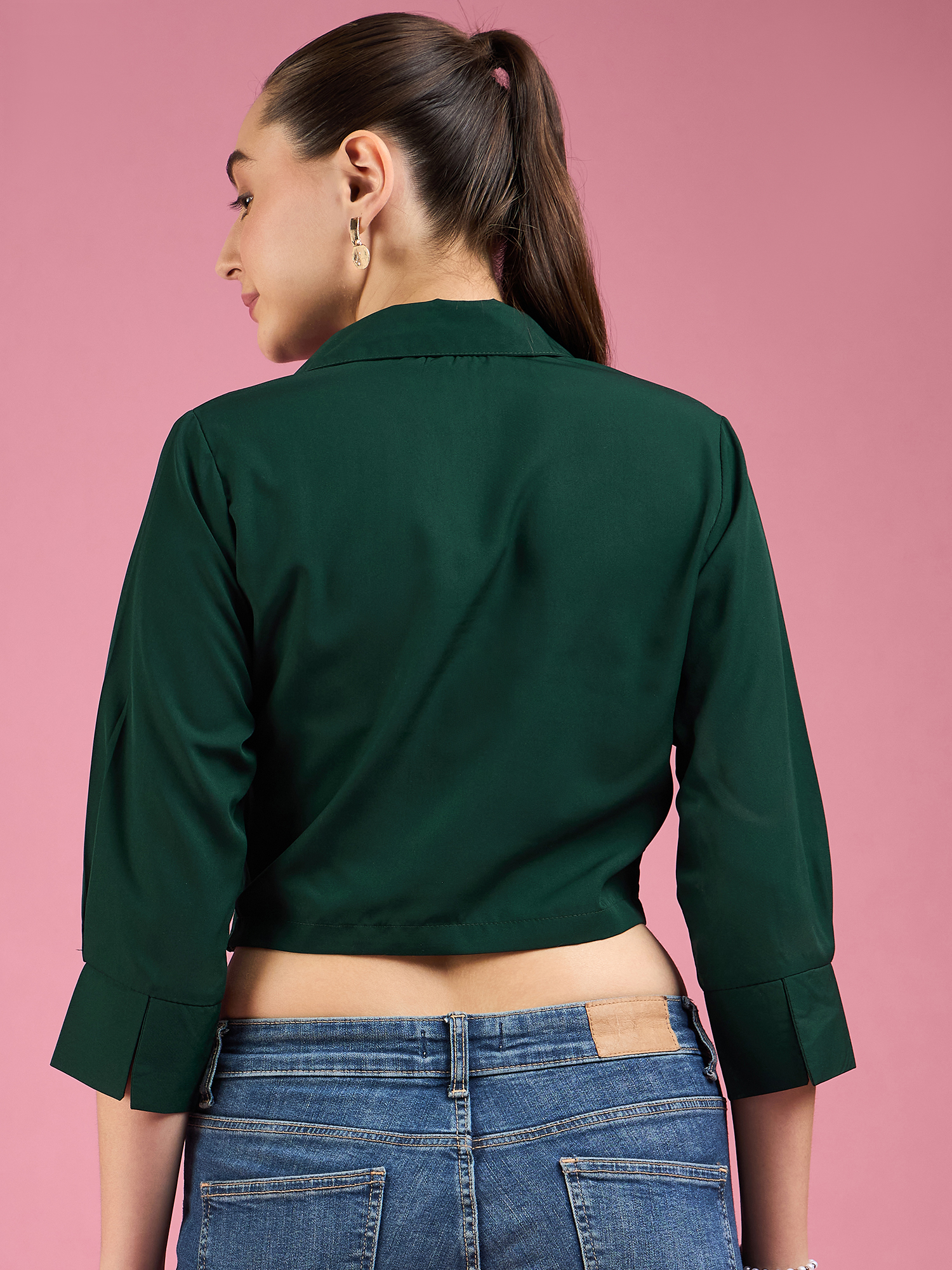 Upgrade your casual wardrobe with this Green Cropped Button-Down Shirt, designed for both style and versatility. Featuring a structured collar, three-quarter sleeves, and a flattering cropped silhouette, this top blends modern fashion with everyday comfort. Whether paired with high-waisted jeans or skirts, it’s an effortlessly chic piece for any occasion.